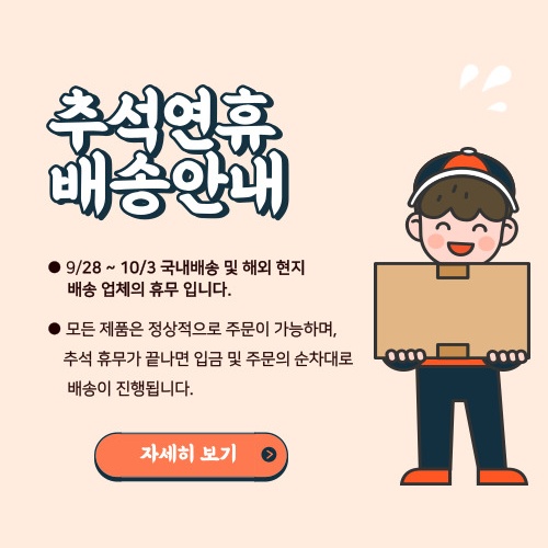 고객님들 모두 추석 연휴 잘 보내시기 바라며 연휴 기간 동안 배송 휴무 안내해드립니다.